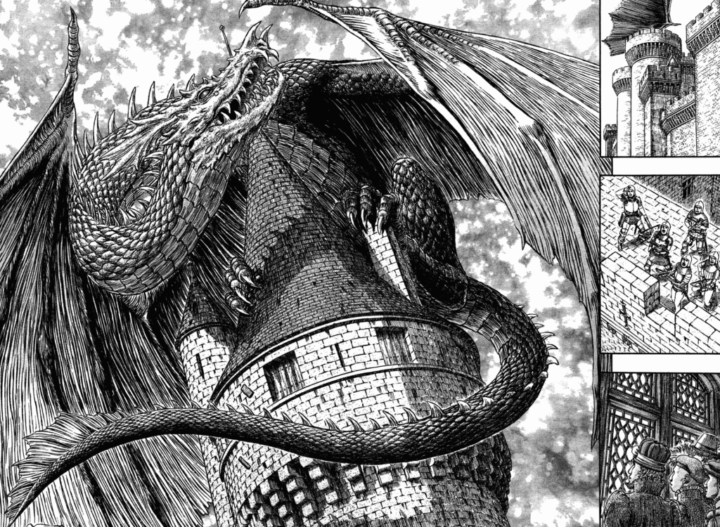 Manga escrito y dibujado por la divinidad Kentaro Miura, famoso por su adicción a juegos de Idols japoneses y su inconmensurable factor irónico, el cual es el hecho de crear uno de los mangas más macabros hasta la fecha, donde trata la historia de Guts, un mercenario que, en un tiempo similar a la edad media, vaga por el mundo con el fin de cumplir su objetivo.
